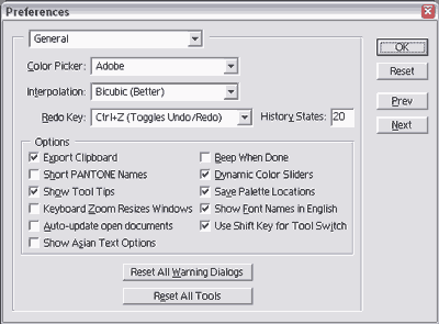 Вкладка General настроек Photoshop 6.01: