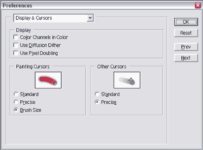 На вкладке Display&Cursors следует включить галочку Diffusion Dither, если ваша видеокарта не поддерживает режим True Color. Тогда Photoshop будет повышать количество цветов на экране за счет рассеивания (dither) имеющихся. Установите переключатель Painting Cursors в положение Brush Size (это позволит видеть реальный размер и форму кисти), а переключатель Other Cursors в положение Precise (перекрестие). Точность вашей работы существенно повысится.