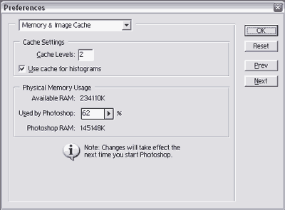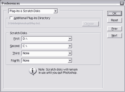 Scratch Disks - это диски, на которые Photoshop скидывает не уместившиеся в памяти данные. Держите рабочий диск дефрагментированным и оставляйте на нем достаточно свободного места. Это "достаточно" зависит от среднего размера обрабатываемых файлов. При работе с графикой для Web, которой присуще низкое разрешение, вполне достаточно иметь 200-300 Mb свободного места на рабочем диске.